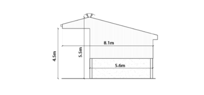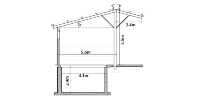 The six-bay shed is 5.5m high at the apex, and it is 31.6m long and 5.6m wide. The concrete walls of the shed stand at 2.4m. The shed is 3.8m to the eve gutters.