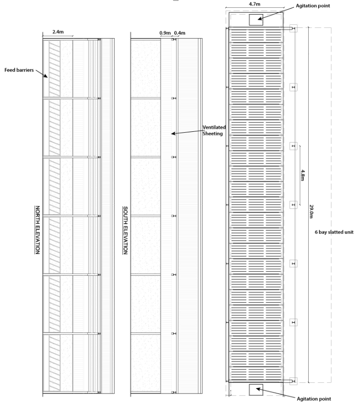 The slatted pens are 4.8m long and 5.2 wide. However, the tank is 29m long and 4.7m wide and 2.4m deep. Two agitation points are located at either end of the tank.