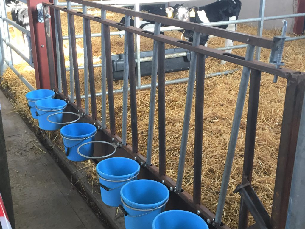 “I bucket feed all the calves once a day. In my opinion, if I feed a batch of calves in a trough or with teats, some calves will miss out. One calf could get 2.5L, while the other could get 3.5L. When the calves are locked in, the bucket is put in front of them and each calf gets its own milk.