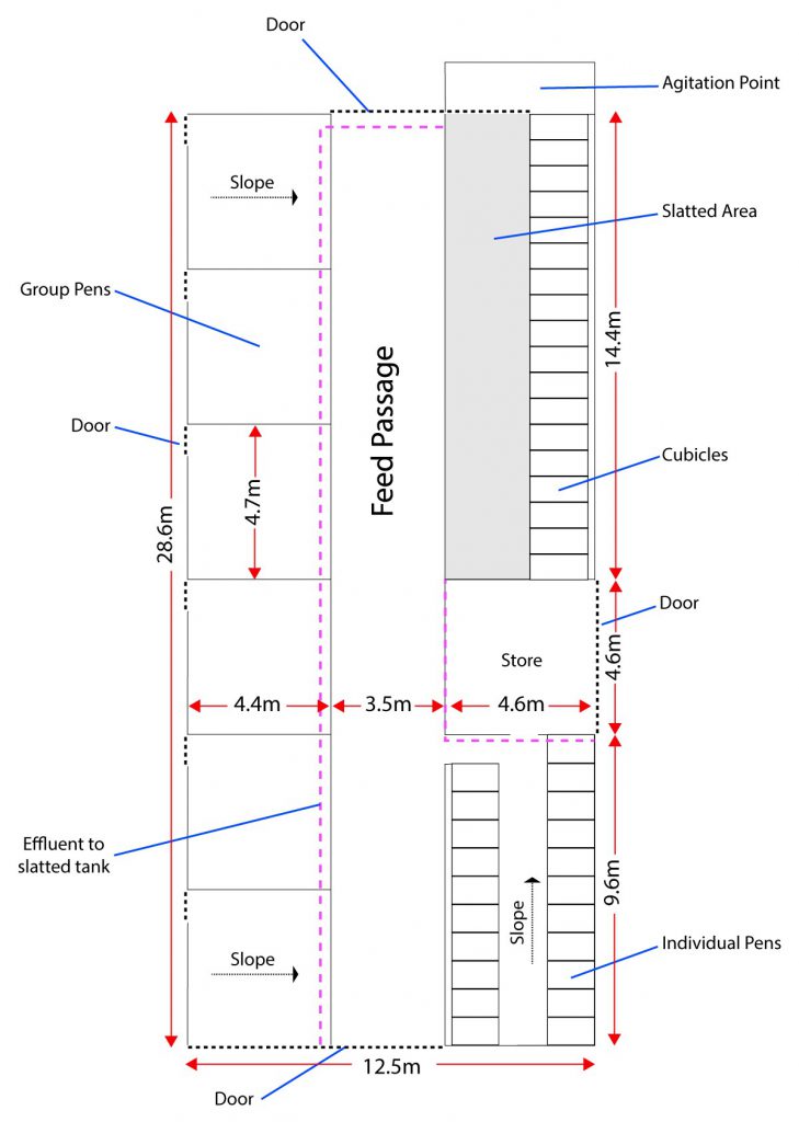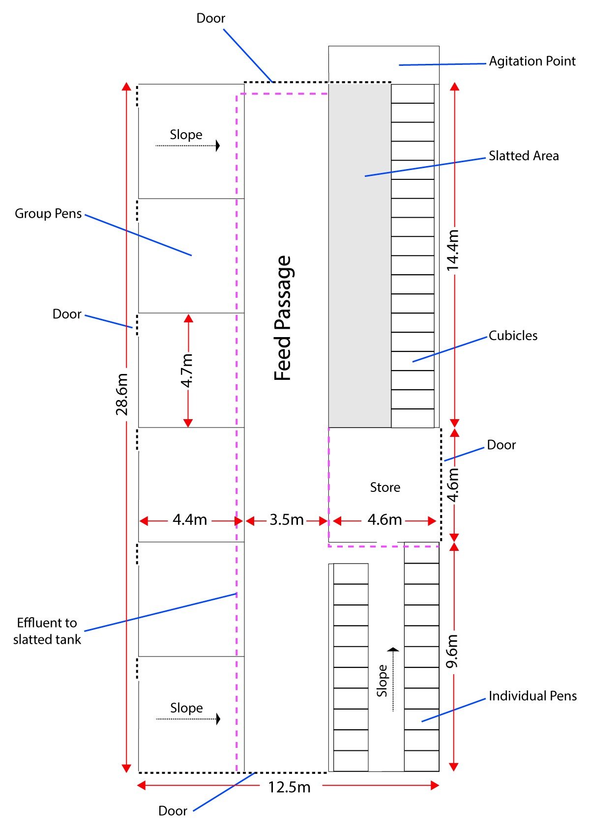 The floors are sloped in the pens to a channel, which will catch any run-off and keep the straw bed dry. These channels are piped to a slatted tank which is also located in the shed.