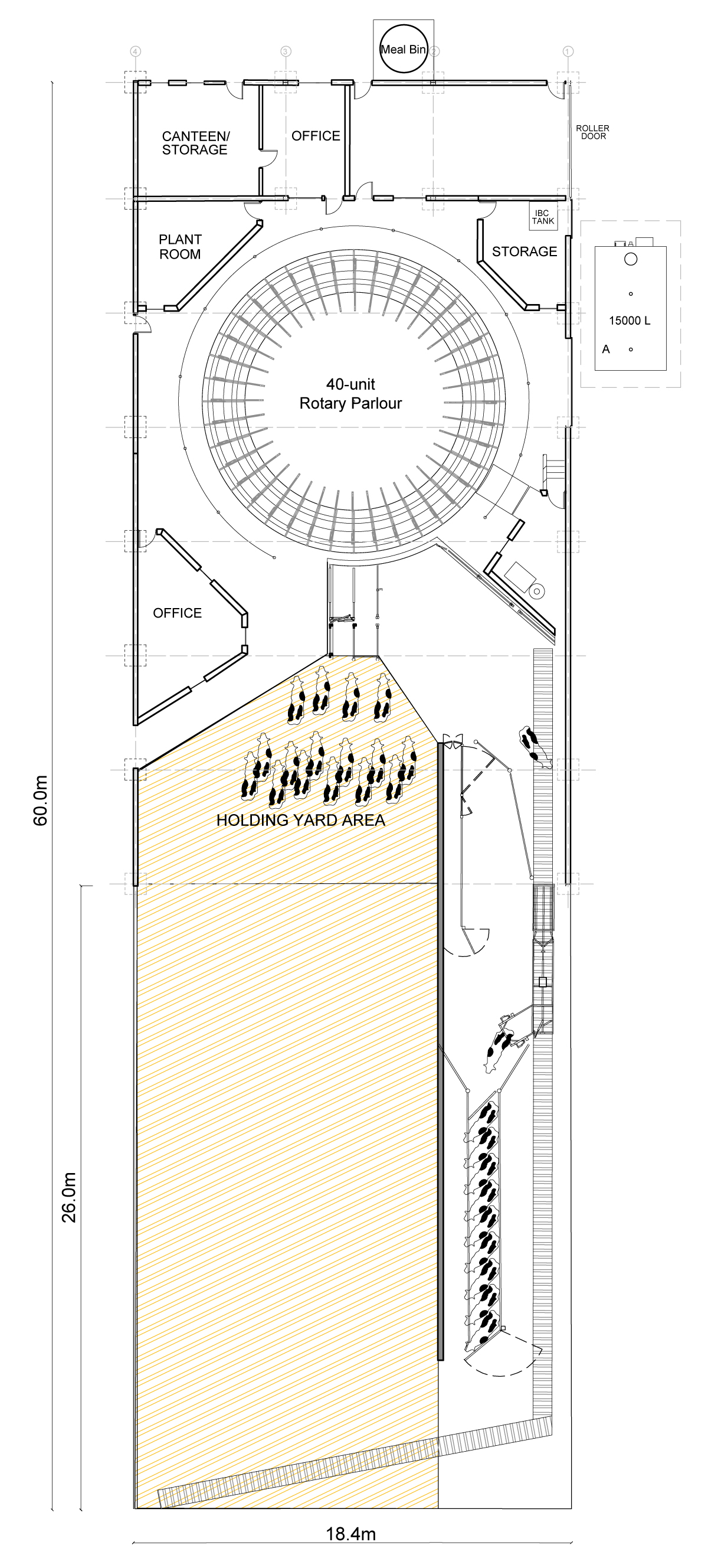 The collecting yard is 35.6m long and 12.8m wide; however, to aid with cow flow, there is a 4.8m angle at the front of the collecting yard to angle the cows towards the race.