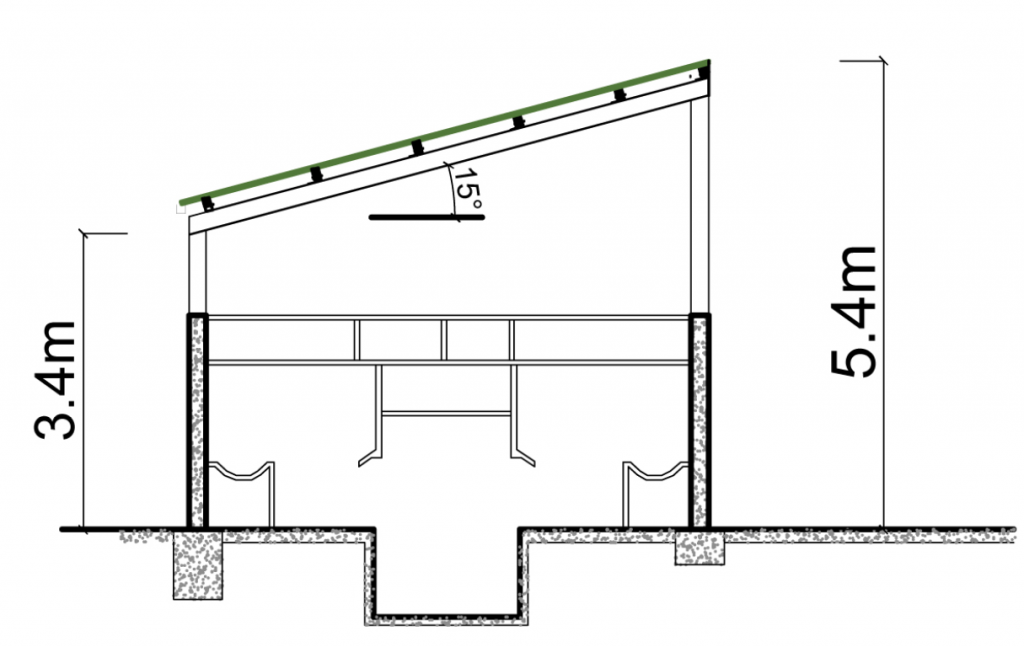 The parlour itself stands at 5.4m high to the apex and is 3.4m high to the eve gutters. The parlour measures 5.5m wide and runs parallel to the holding yard, which is 6.5m wide.