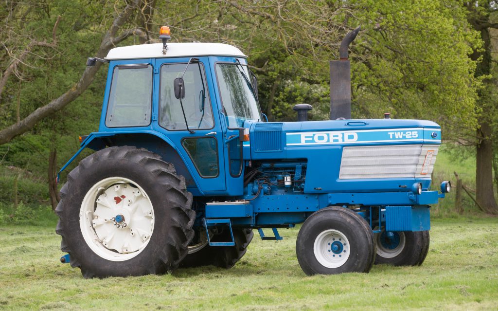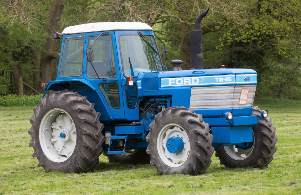This 1984 (six-cylinder) Ford TW-25 (above) is notable for being a 2WD version. It comes with a rear linkage, drawbar, PAVT rear rims, inside rear wheel weights, under-slung front weights and a Q cab. It’s shod on 18.4 R38 rear and 11.00-16 front wheels and tyres. 8,014 hours are showing on the odometer. Its serial number is 911945.