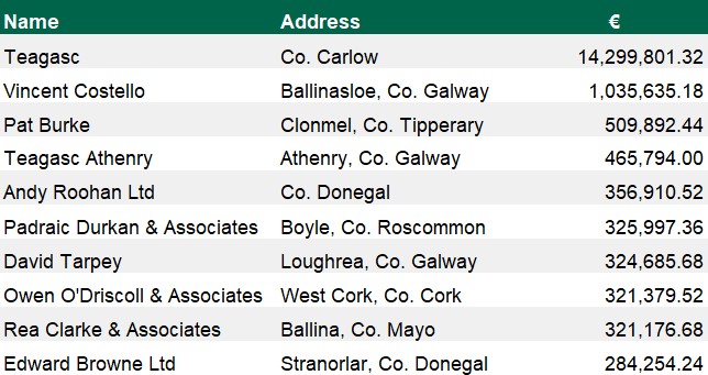 Vincent Costello Agricultural Consultancy, based in Ballinasloe, Co. Galway, received €1,035,635.18 under the category.