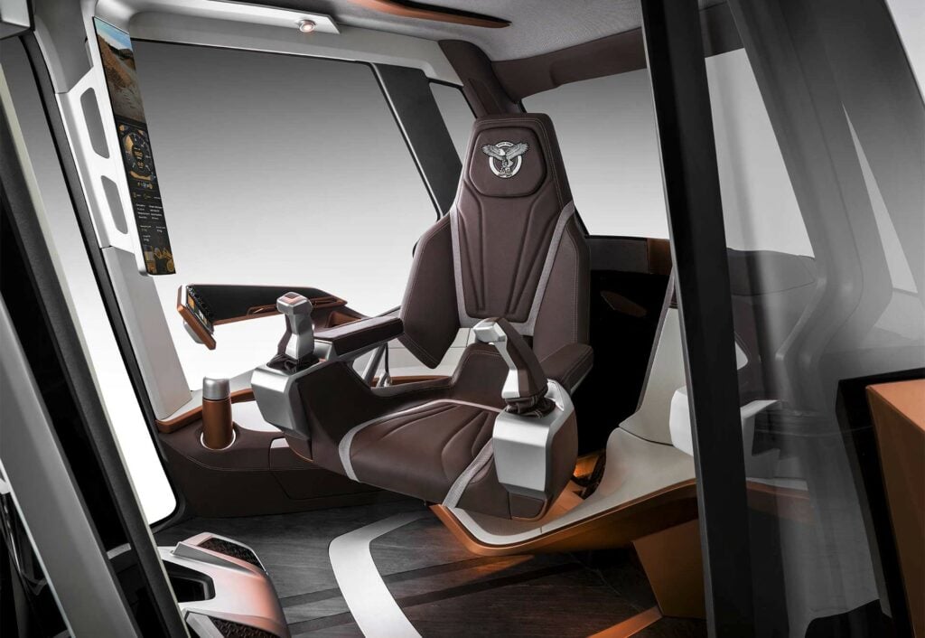 The uncluttered design means all controls are accessed through what Case describes as “ergonomic joysticks and an integrated, armrest-mounted, colour touchscreen monitor”.