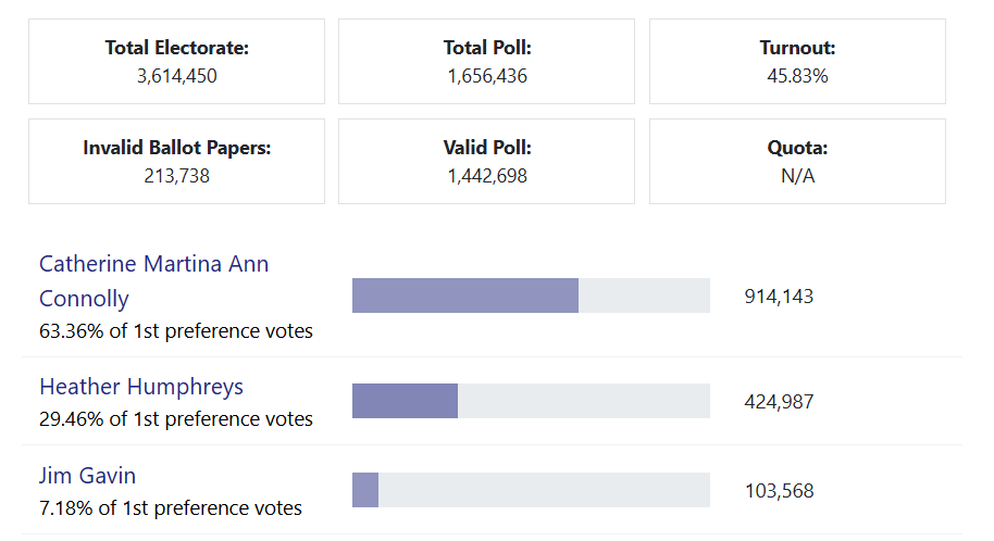 Catherine Connolly secured 914,143 votes while her opponent the Fine Gael candidate, Heather Humphreys, received 424,987 votes.