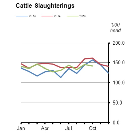 From January to October 2015 compared to the corresponding period last year, there’s been a 5.3% drop in cattle slaughterings.