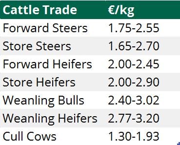 The beef and forward cattle trade is holding well, with forward steers trading from €1.75-2.55/kg and beef heifers making €2.00-2.45/kg, he said.