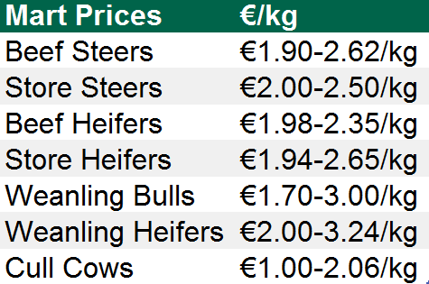 Beef and store heifers are still trading well with these lots selling from €1.90-2.62/kg for the steers and €2.00-2.50/kg for the heifers.