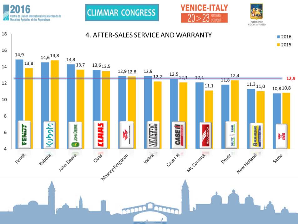 Looking at ‘after-sales service and warranty‘ dealers put Fendt in poll position, followed by Kubota, John Deere, Claas and Massey Ferguson – in that order. The result had been largely similar in 2015, though Kubota scored slightly higher than Fendt then.