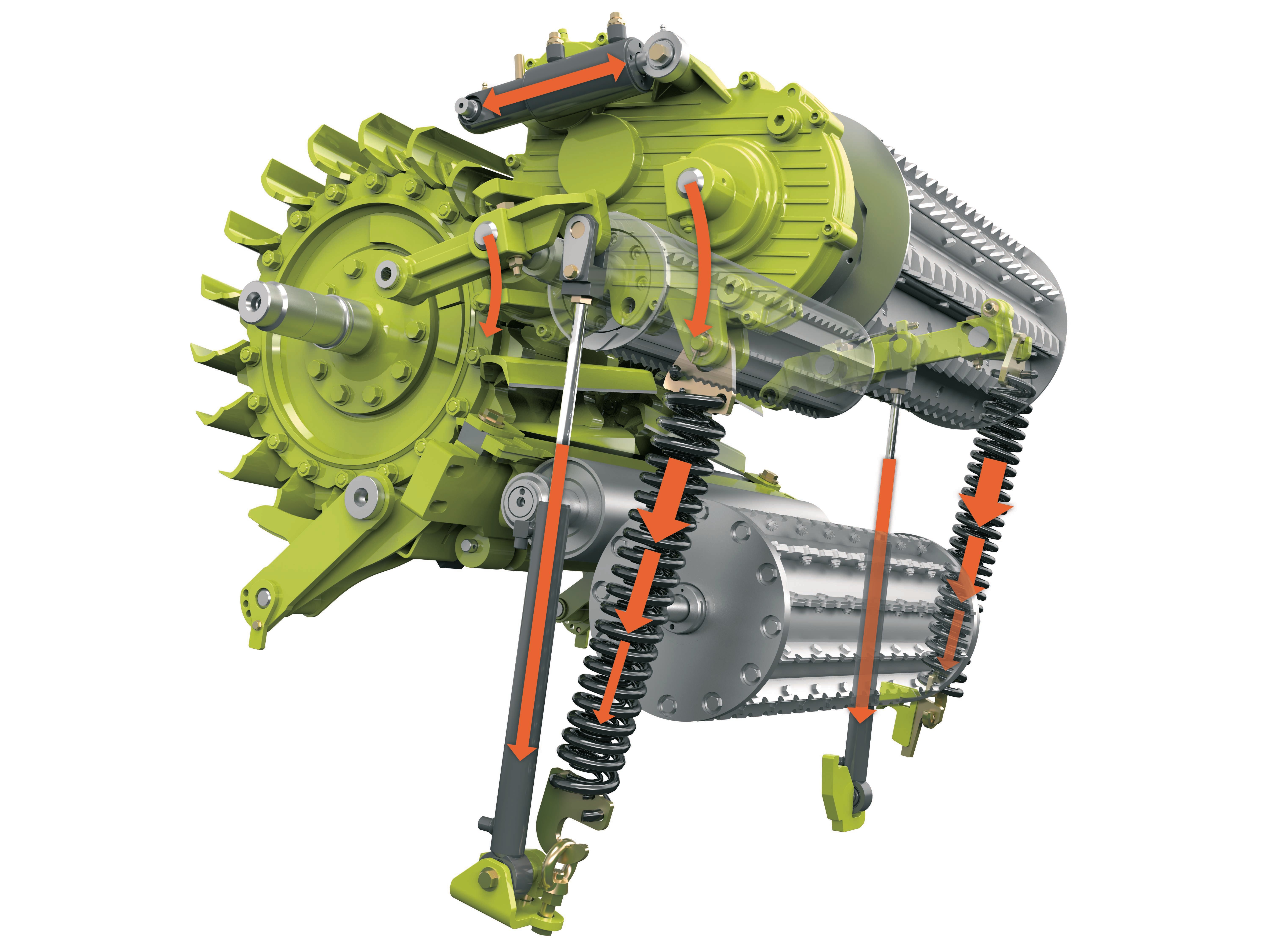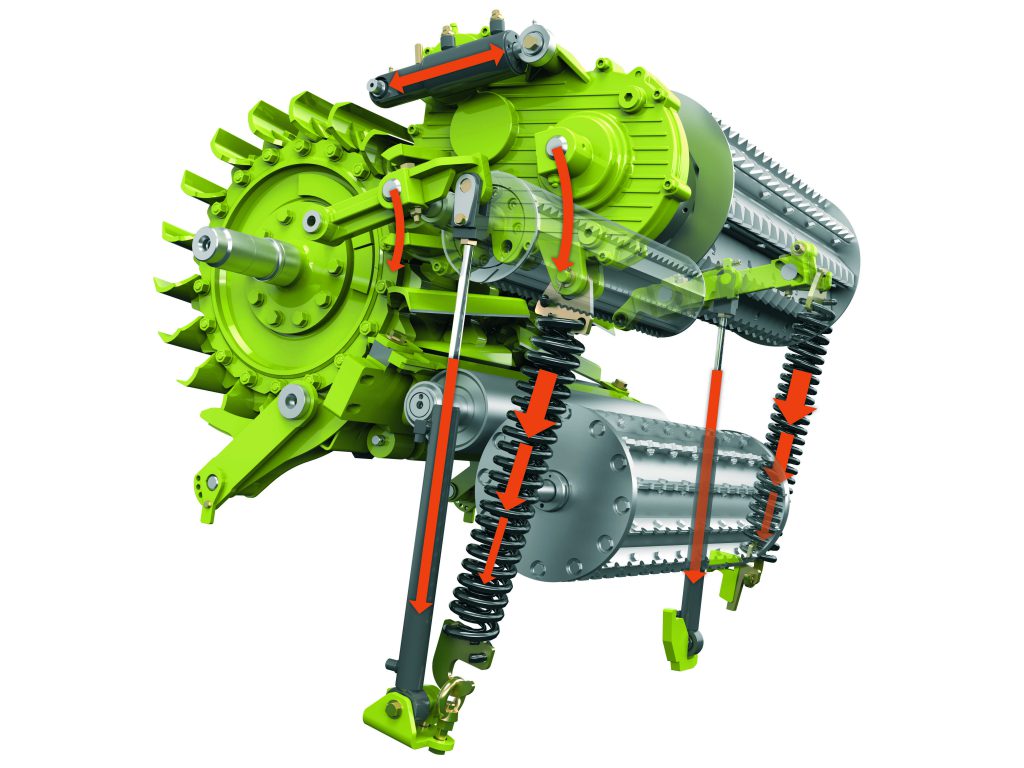 The latest 900 series machines get a new hydraulic pre-compression system, whereby the two rear springs on the feed-rollers (of the feeder housing) have been replaced by hydraulic rams with pressure reservoirs.