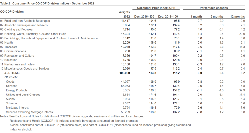 For Ireland, as the table below shows, inflation pressures have seen the overall cost of living increase by over 9% at peak, with it still running at over 8% in September, according to the latest set of figures from the Central Statistics Office (CSO).