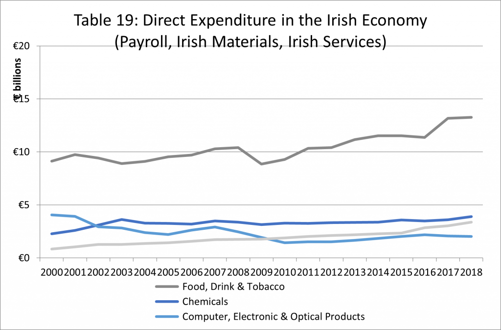 Moreover, as the chart below – which measures Irish economy spend by economic sector – shows, spending by the food and drink sector is approximately five times the level of Irish economy expenditure any of the multinational sectors.