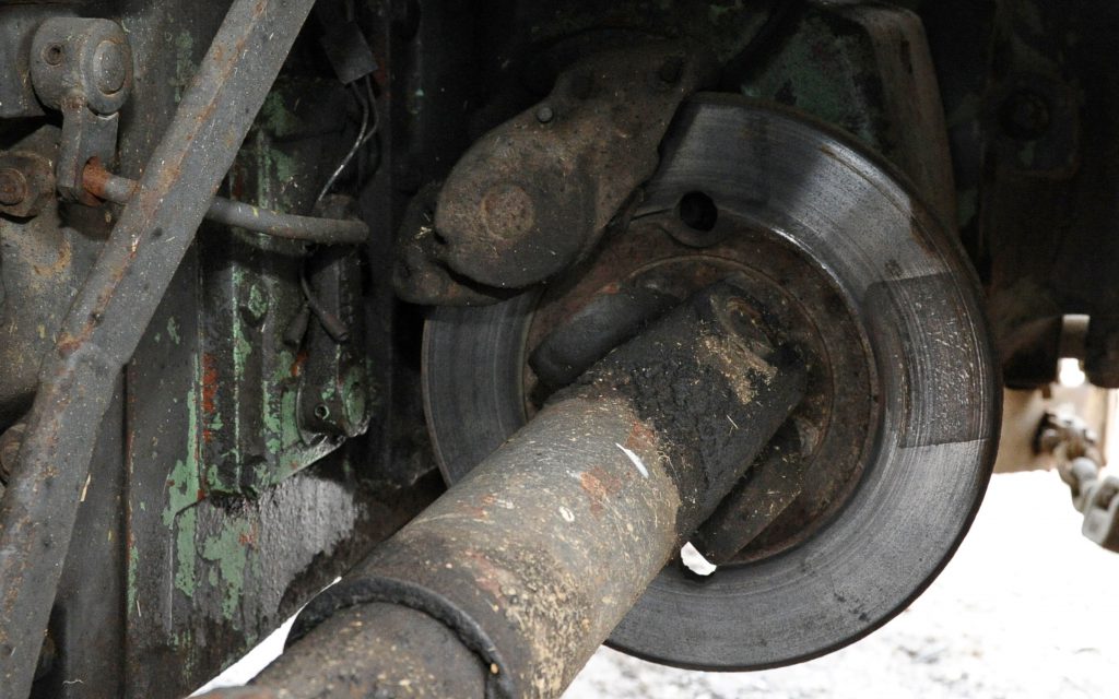 The front is an entirely different matter. The single disc and pads are mounted on the prop-shaft where it exits the transmission. The unit is in the open air and easy to get at, but looks rather inadequate for the job. Yet, Seamus has no complaints about its efficacy.
