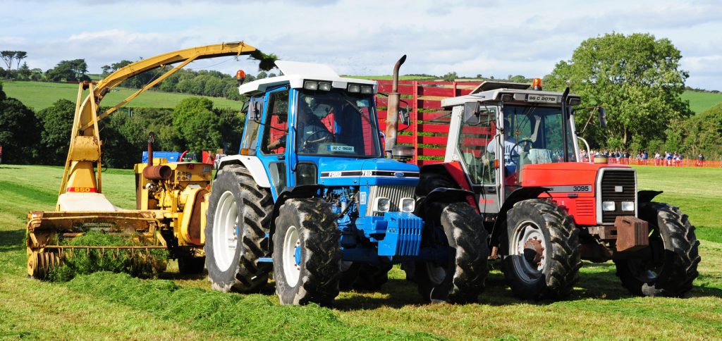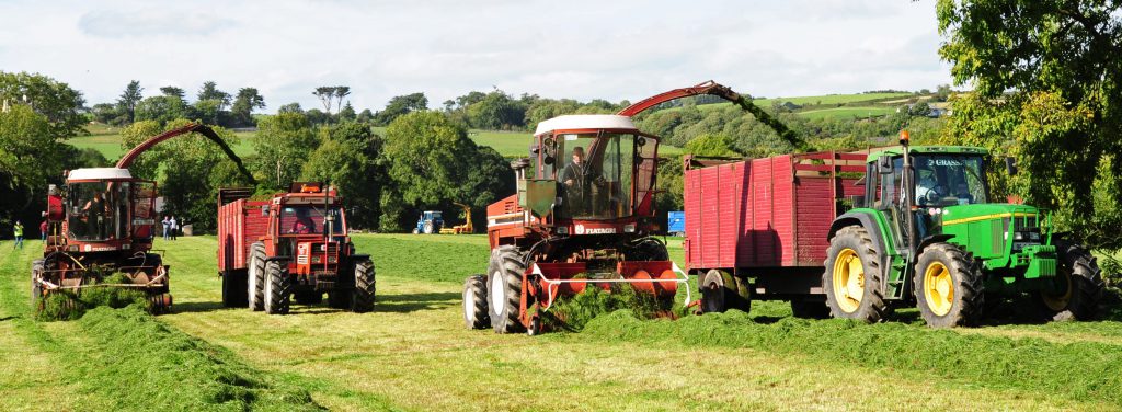 John Deere tractors belonging to John and Ricky O’Leary were also present – one of which was coupled to a Taarup double-chop harvester (effortlessly scything across its full working width).