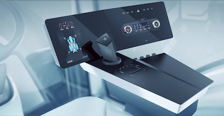 The Preh vision of an “intuitively-operated” driver’s workplace for agricultural machinery certainly has a striking design. It consists of a double-display unit and a console with a greatly-reduced number of switches – thanks to the use of the latest technology.