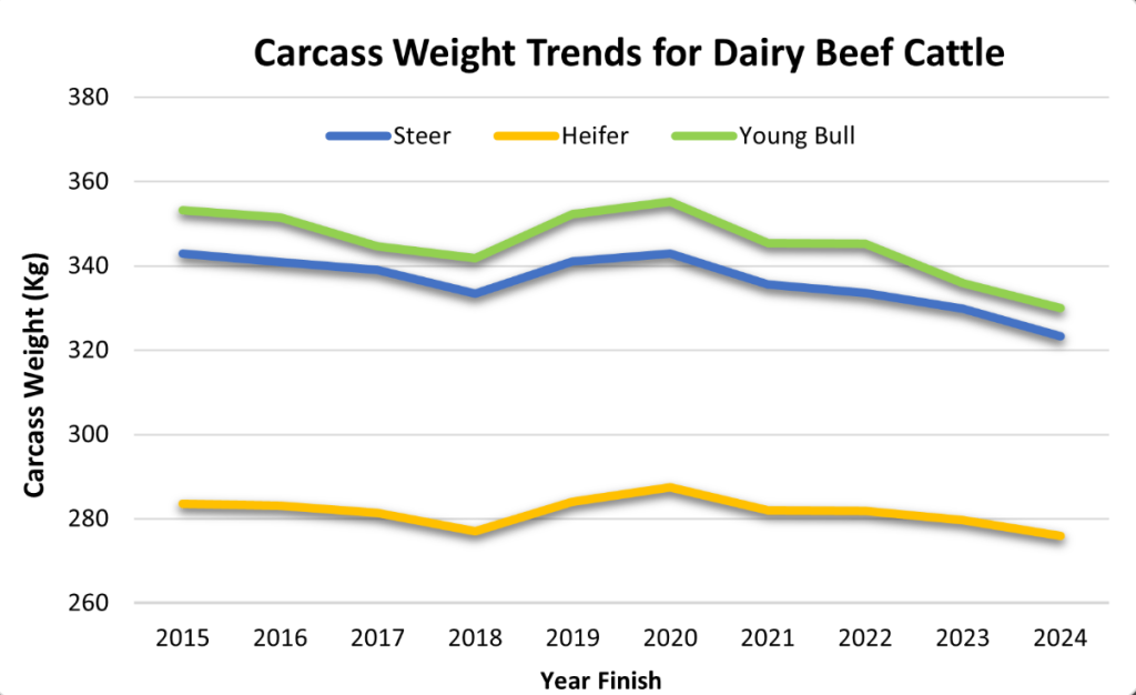 The ICBF data shows shows an overall decline in dairy-beef carcass weights since 2020, with this trend more noticeable in male dairy-beef cattle.