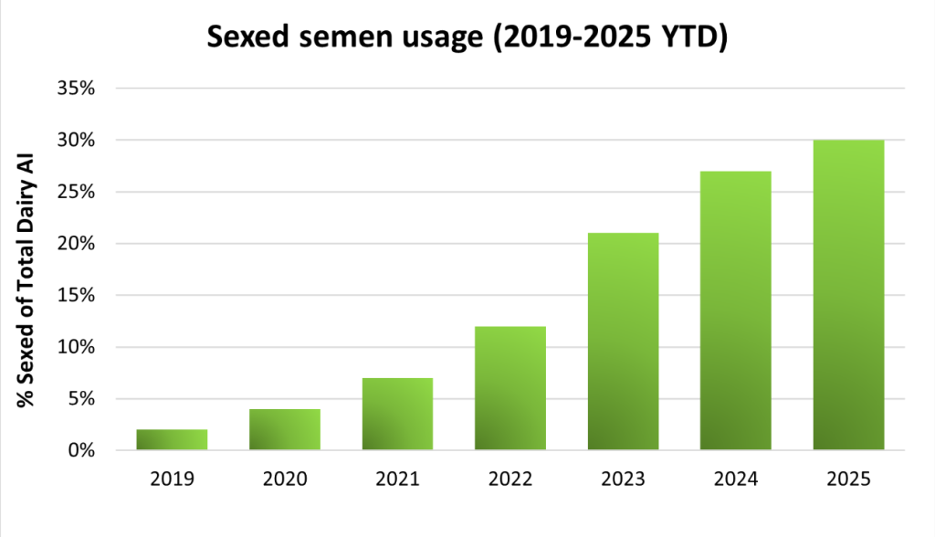 Over 6,000 herds used sexed semen in 2025 and 30% of the total artificial insemination (AI) serves on dairy cows has been to sexed semen.