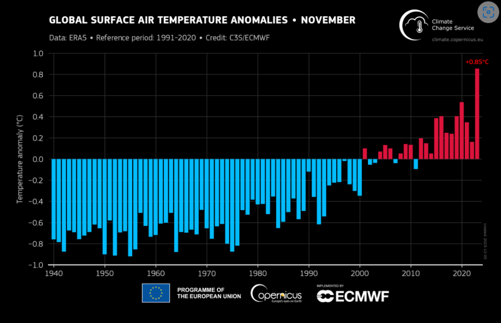 The latest data shows that November 2023 was the warmest November on record globally, with an average surface air temperature of 14.22°C, 0.85°C above the 1991-2020 average for November, and 0.32°C above the temperature of the previous warmest November, in 2020.