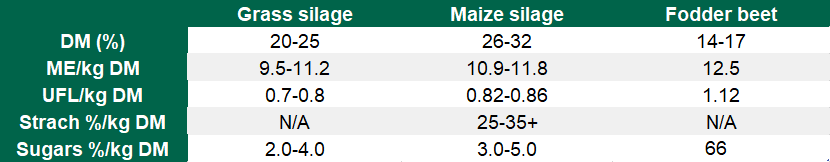 Although fodder beet has the lowest dry matter (DM) percentage of the three crops; it has the highest ME (metabolisable energy), UFL and sugar values. Maize silage rates highest over grass silage for DM percentage, ME, UFL and sugar values.