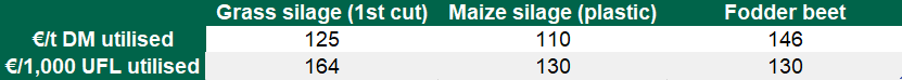The table below shows that beet is the most-expensive crop per tonne of dry matter. But, it is on a par with maize when examined on the cost per 1,000 UFL utilised (€/1,000 UFL utilised).