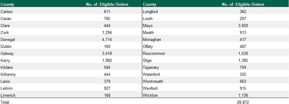 The lion’s share of the eligible orders came from counties Donegal, Mayo and Galway, which had the highest number in the country with 4,714, 3,820 and 3,419 respectively – all substantially more than the county with the next highest number, which was Kerry, with 1,982.