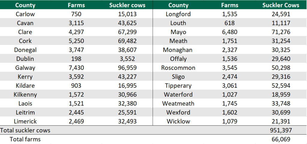 Co. Galway had the greatest proportion of suckler cows, with 96,959 head, spread across 7,430 farms; this was also the highest number of farms in a single county.