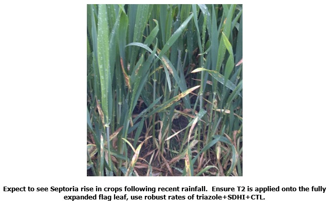 Septoria levels have visibly increased with active lesions on leaf 4. The T1’s, where applied onto a fully emerged leaf 3 and part of leaf 2, would be expected to give good protection. Delay the T2 until the flag leaf is fully emerged.