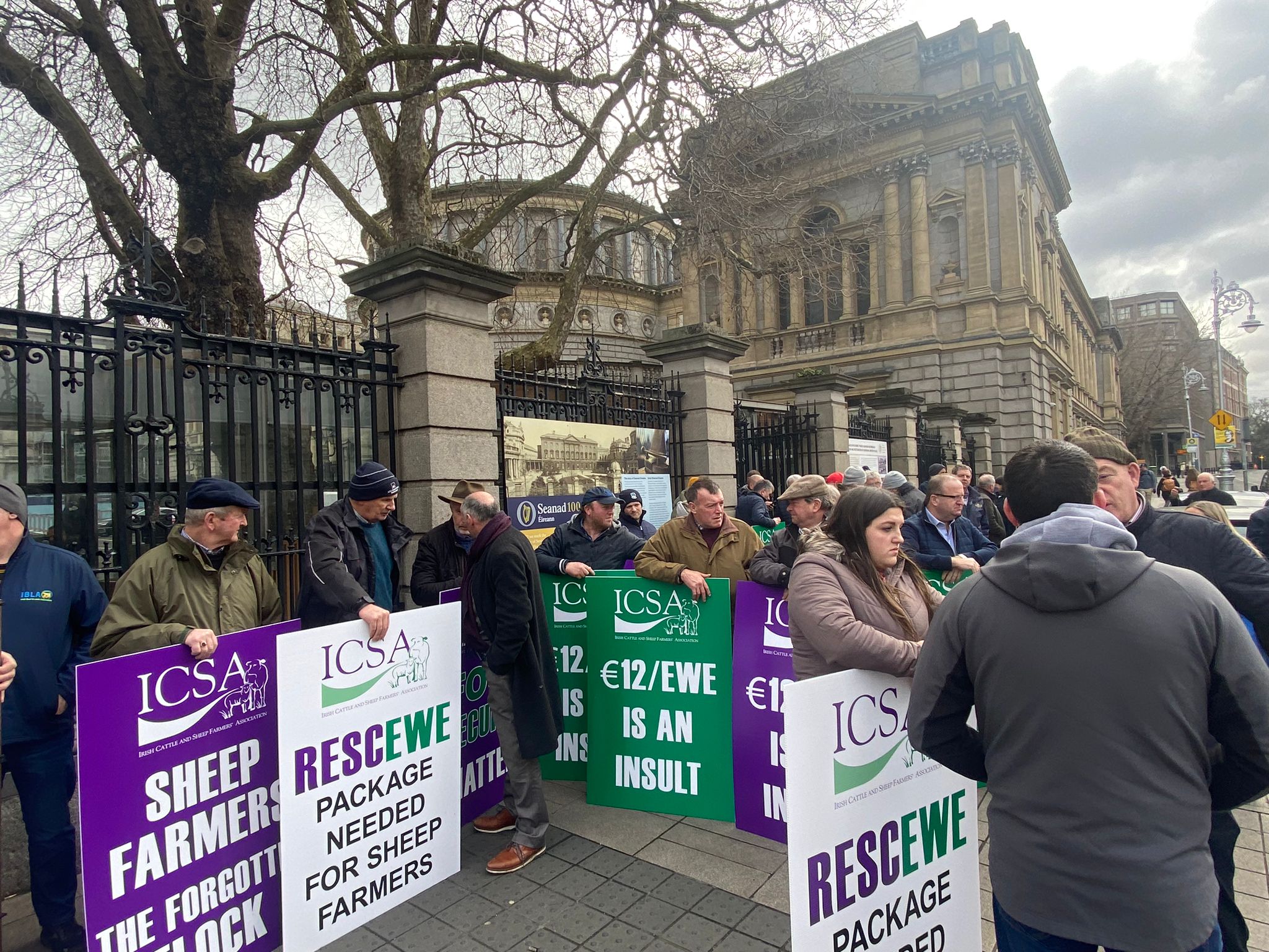 Members of the Irish Cattle and Sheep Farmers' Association (ICSA), politicians and farmers have gathered outside the Dáil and the Department of Agriculture, Food and the Marine (DAFM) "to fight for the survival of the sheep sector" today (Tuesday, February 28).