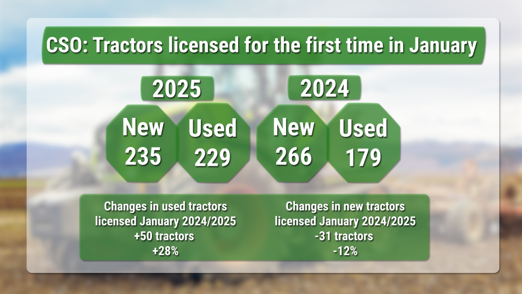 The latest figures for tractor registrations for January 2025 show a decline of 11.7% from January of 2024 and are 7.3% down from the average of the last 10 years according to the Central Statistics Office (CSO).