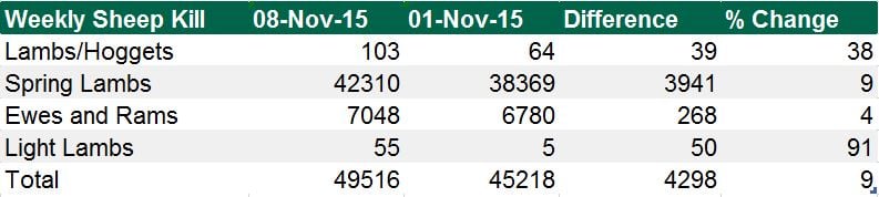 Last week’s national sheep kill currently sits at 49,516, figures from the Department of Agriculture show, this is an increase of 4,298 from the week ending November 1, 2015.