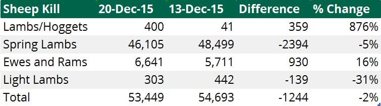 The national sheep kill for the week ending December 20, 2015 was up by 1,601 head on the corresponding period last year, figures from the Department of Agriculture show.