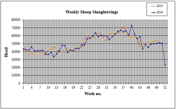On a weekly basis, for the week ending December 20, 2015 some 53,449 sheep went to the factories.