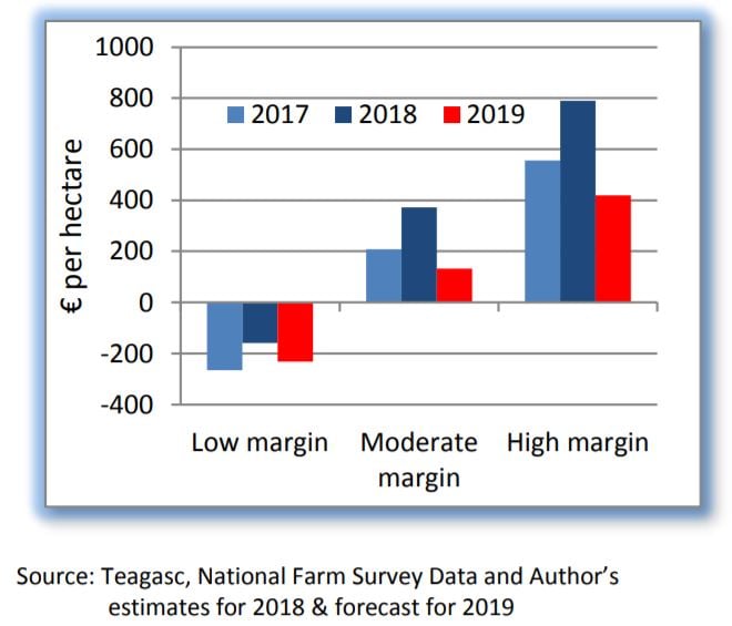 The gross margin of spring barley is estimated to decrease by €100/ha on 2018 levels, while the gross margin for winter wheat is expected to drop massively – €400/ha on 2018 levels.