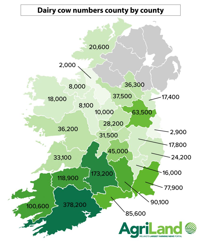 Next in line is Co. Kerry at 100,600 dairy cows – making up almost 7% of the total number.