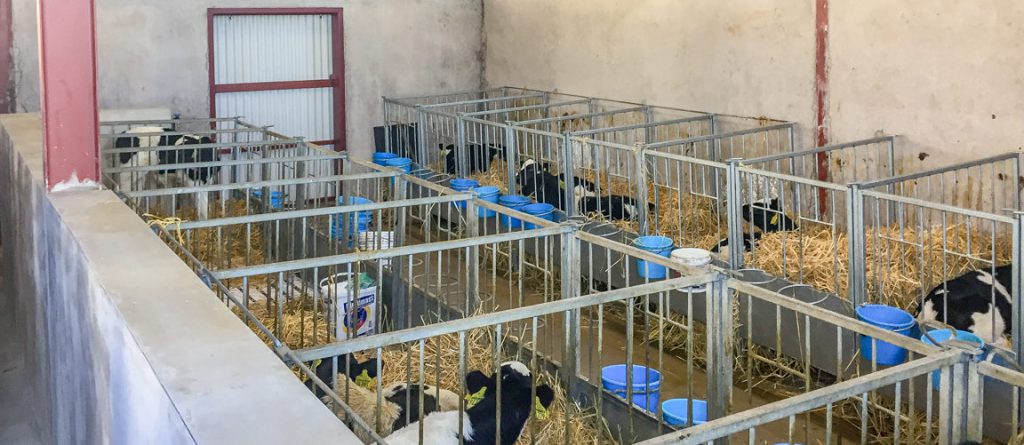 The shed stands at 96ft long and 40ft wide and it encompasses an area for newborn calves, group pens, a hygiene area and cubicles for weaned calves.