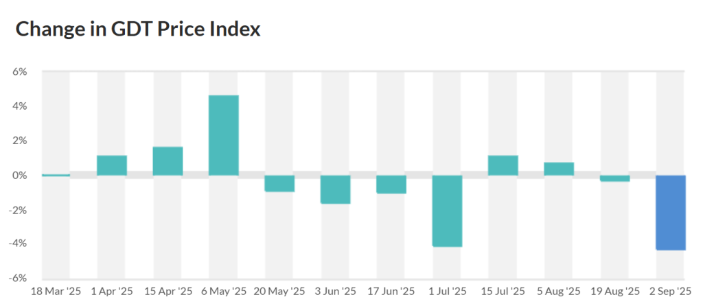 The average Global Dairy Trade (GDT) price index decreased by 4.3% following the latest auction today (Tuesday, September 2).