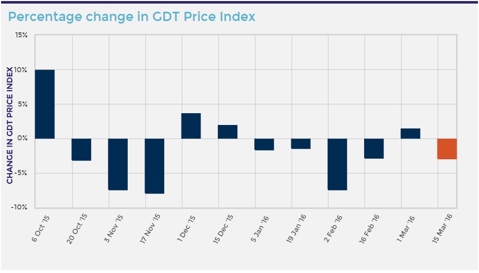 The sixth Global Dairy Trade auction of the year has posted a drop in dairy product prices of 2.9%.