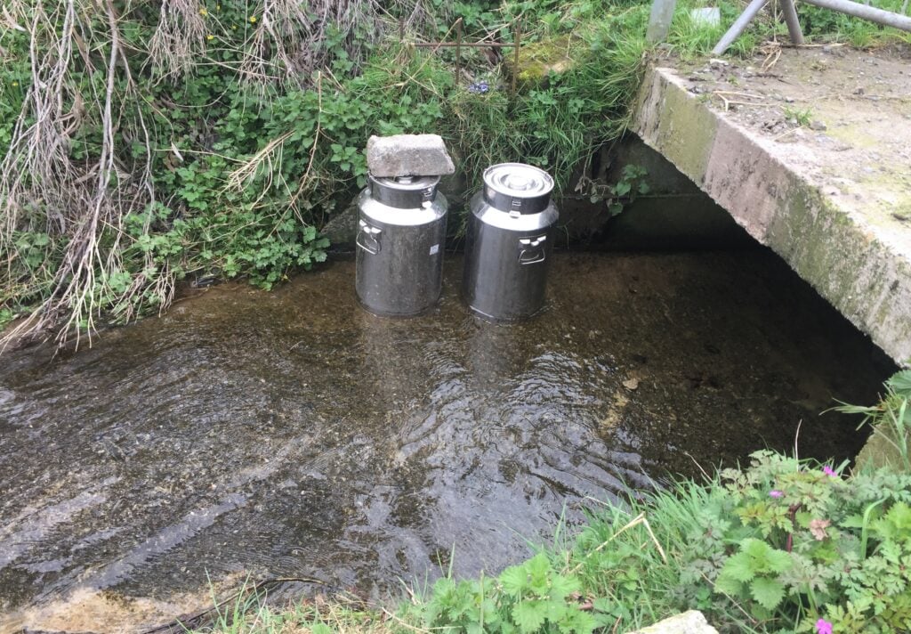 An emergency supply of colostrum is kept cool in old creamery cans in a stream next to the parlour.