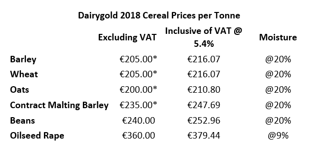 Dairygold has finalised its 2018 cereal prices following a harvest which has been completed two weeks earlier than normal.