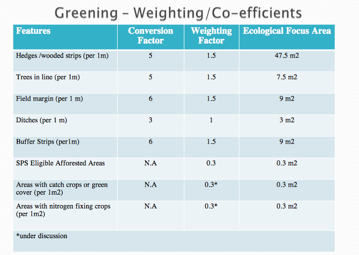In terms of types of EFA, he said land lying fallow; landscape features, including those situated adjacent to arable land; buffer strips, including buffer strips situated in permanent grassland; short rotation coppice, no use of mineral fertiliser and/or plant protection products; and eligible SPS afforested areas; areas of catch crops or green cover; and areas of nitrogen fixing crops.
