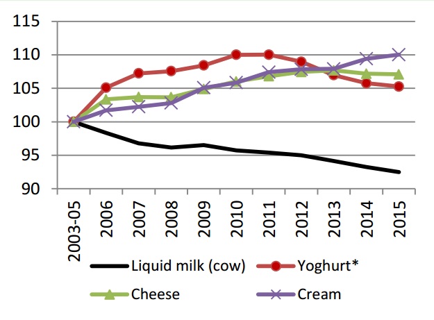 The steady increase in exports of drinking milk (+19% in 2015 compared with 2014) is not enough to compensate for the decrease in per capita consumption.