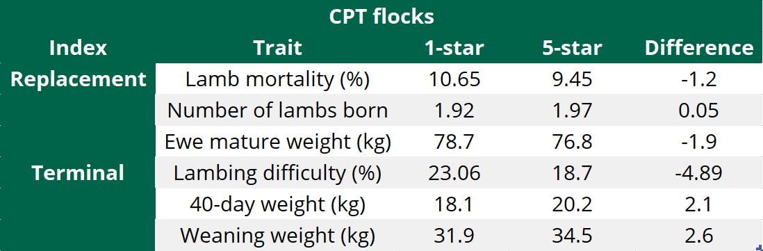 “The 5-star animals are having lower lamb mortality percentages and higher numbers of lambs born. They’re reflecting what’s happening on CPT flocks.”