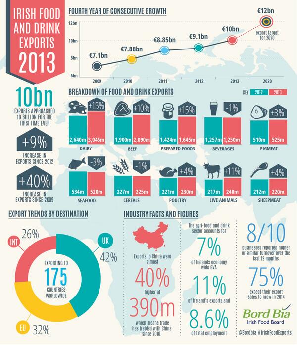 Minister for Agriculture, Food and the Marine, Simon Coveney, TD said: “Significant growth in 2013 has brought export values in the Irish food and drink sector to record levels. This leading performance in what was a challenging year for the industry, highlights the key role of agri-food, Ireland’s largest indigenous sector, in underpinning exports and economic activity.
