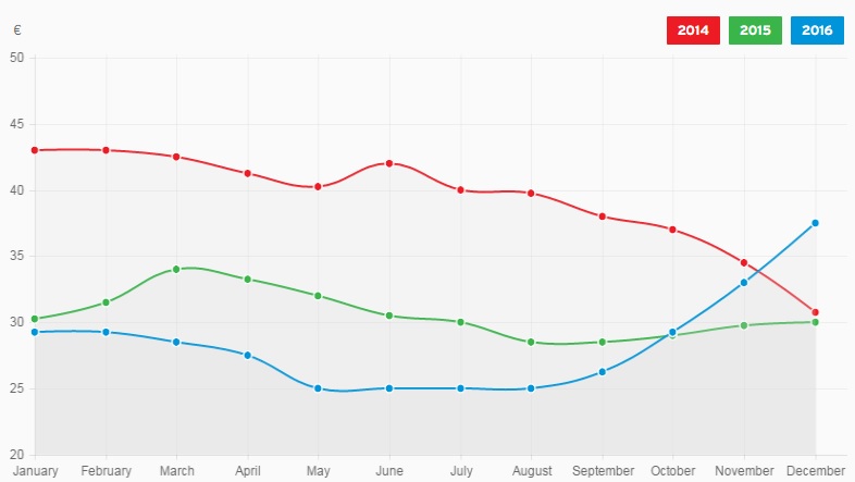 The protein price in December 2016 is €612.14, the fat price is €306.07 and the lactose price is €61.21 perkg.
