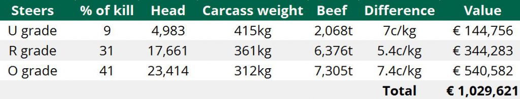 And when the price increases mentioned above are considered; this means that an additional €144,756 was received for the U-grade animals slaughtered in June, R-grade returns jumped by €344,283 and O-grade prices improved by €540,582.
