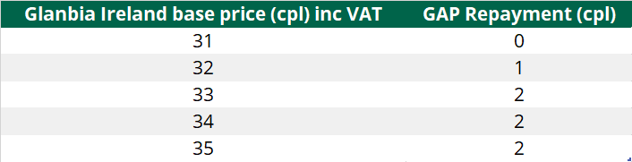 The trigger for commencing interest-free ‘return’ payments to the GAP Scheme is a GI base manufacturing milk price of above 31c/L including VAT.