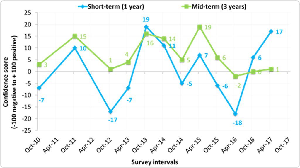 Although the short-term outlook rose from a low of -18 points to +17 points amid expectations that a weak sterling would help boost the industry, Raymond warned that farming businesses were long-term and “cannot rely on currency fluctuations”.