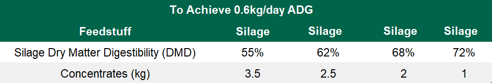 Farmers with good-quality silage (68-70% DMD), Teagasc says, should be feeding 2kg of concentrates in order to achieve an ADG of 0.6kg/day. Farmers feeding poorer-quality silage may need to increase concentrates by 1-2kg/day.