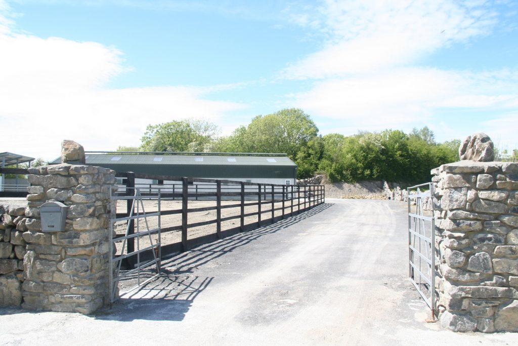 This purpose-built facility consists of a large steel portal frame building with a cement fibre roof, wide central passageway accommodating 14 stables, a feed store and a tack room with sliding doors at the end of the passageway.